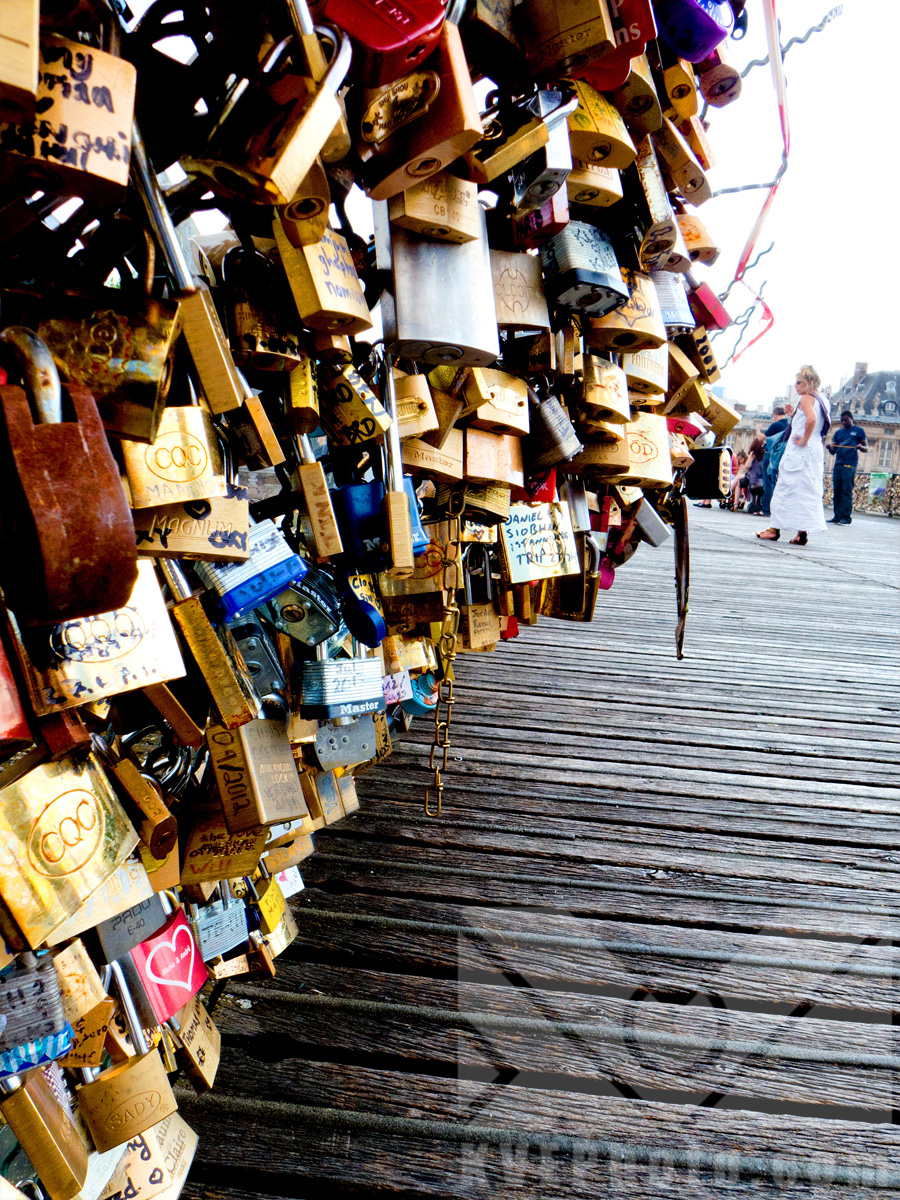 Finally, we left the Louvre, in search of a cafe and a concert. But first, we had to cross the Pont des Arts again. Though we could not locate our lock, I did see this bit of fence which had started to fall down from the weight of the locks. I thought it was a good metaphor, and a bit unique, so here it is, the Pont des Arts, pulled down from the weight of love.